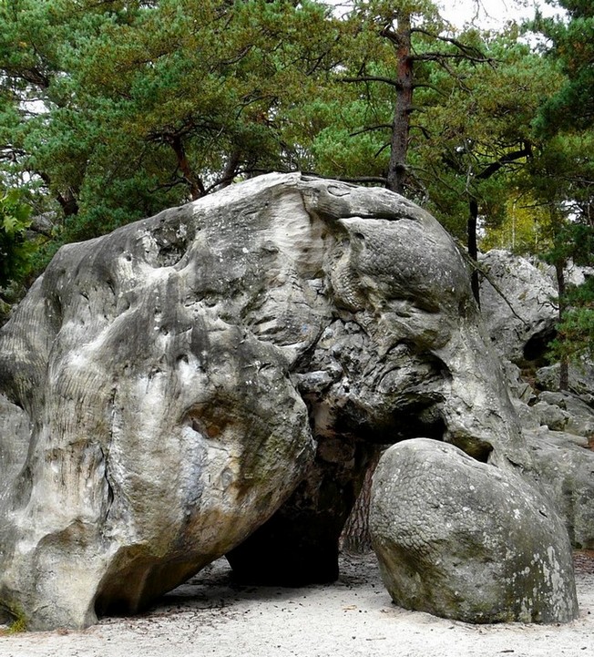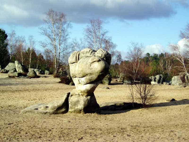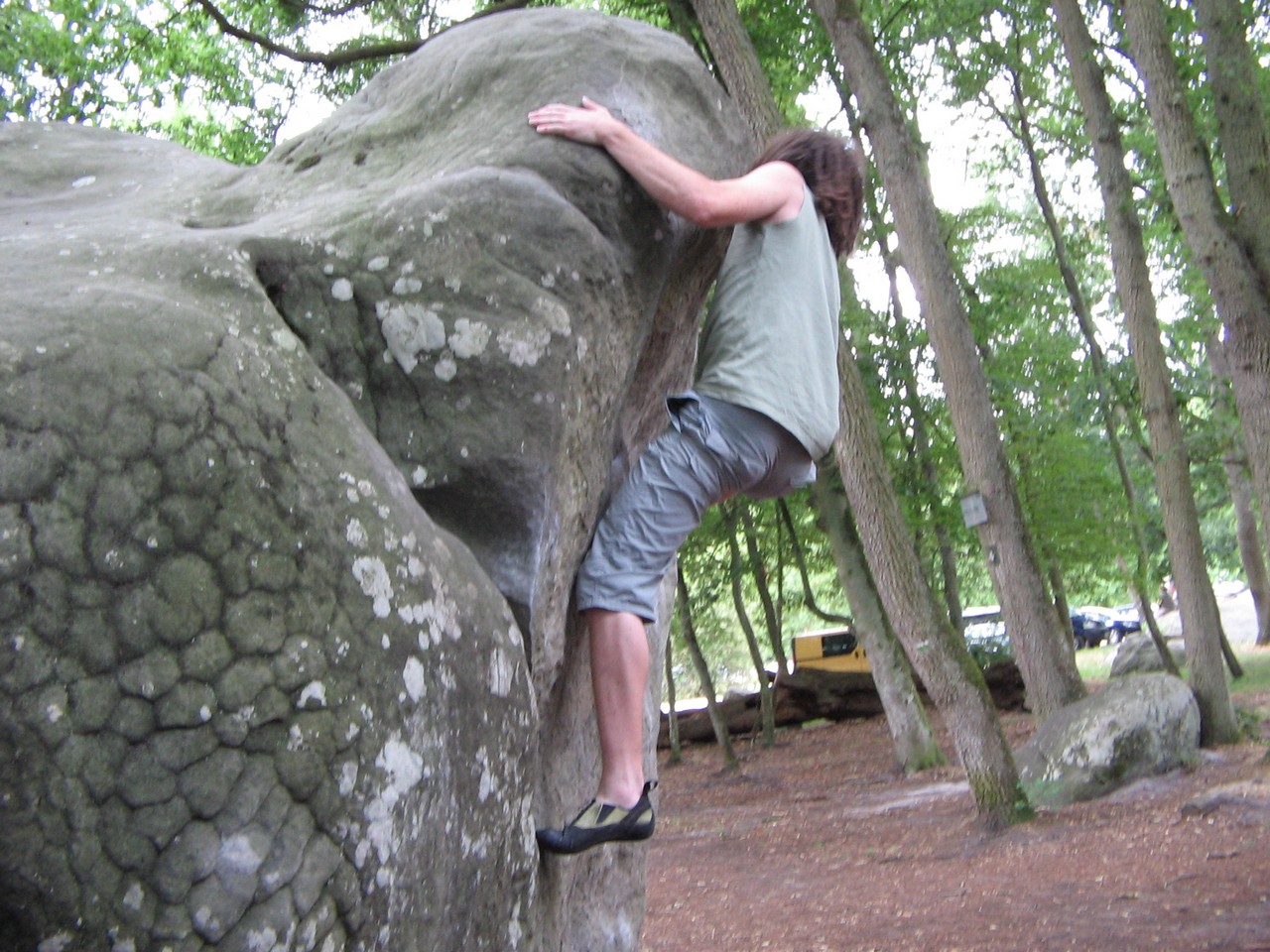 A Fontainebleau on grimpe sur du grès. Le grès est une cimentation de grains de sable formant des rochers compacts en surface ce qui nous donne des blocs aux formes parfois originales et variées.